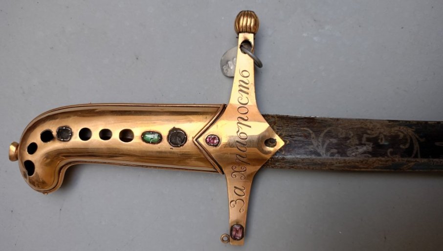 МЕЂУ изложеним оружјем истиче се златна сабља војводе Милана Обреновића коју му је по препоруци руског изасланика у Београду Константина Родофиникина, уручио заповедник руске Дунавске армије, славни кнез Петар Иванович Багратион. Он је, 3. јанура 1810, пред постројеном војском свечанио уручио сабље и грамате војводама Милану Обреновићу и Петру Добрњцу „за отличну храброст и приврженост к Русији“. Сабља има позлаћени балчак израђен у облику „дршке пиштоља“. Првобитно је дршка била обострано украшена са по девет зелених и црвених драгуља. На предњој страни накрснице, некада такође украшеној драгуљима, угравирано је „за храброст“ – каже наш саговорник.
