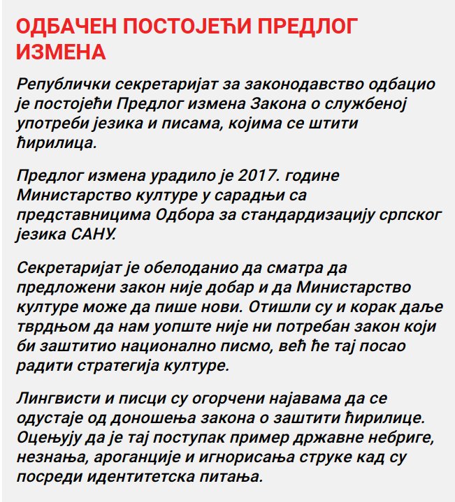 Откуда онда оволики нехај према ћирилици, данас и овде у Србији? Оставимо историју руинирања ове културне тековине онима који се баве језичком прошлошћу. И положај ћирилице у СФРЈ остављамо по страни у овој анализи, иако није занемарива и ова чињеница. Да размотримо однос према ћирилици у Србији у последњих десет година. Шта можемо да констатујемо?