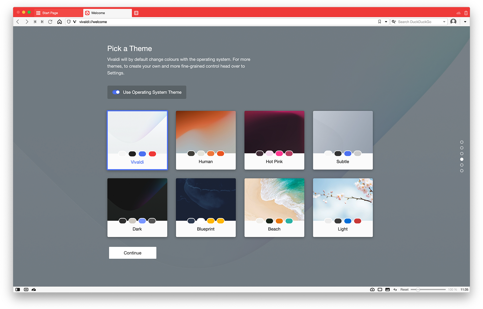 Тема има осам основних, укључујући тамну, а ако вам се ни једна не допада, у самом прегледачу можете направити сопствену, експериментишући са комбинацијама позадине, боја и наглашавањима осветљености.