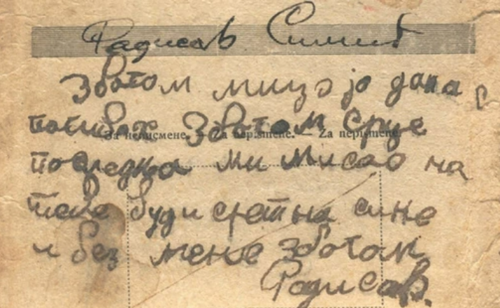 Музеј у Крагујевцу чува на десетине таквих поздрава. Један припада Радославу Симићу.“Збогом, Мицо. Ја данас погибох. Збогом, срце. Последња ми мисао на тебе. Буди сретна, сине и без мене“ написао је човек, вероватно својој ћеркици.