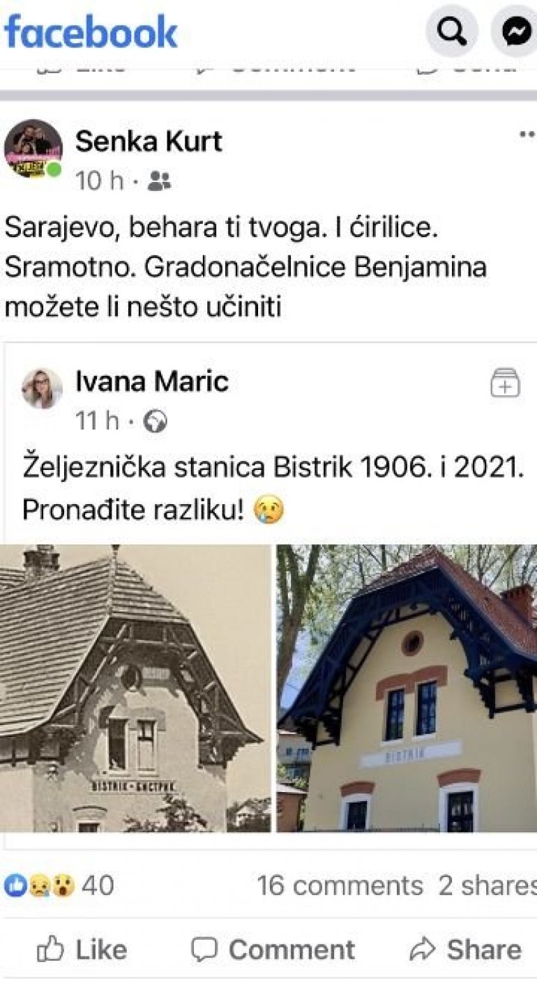 -Сарајево, бехара ти твога. И ћирилице. Срамотно. Градоначелнице Бењамина можете ли нешто учинити – написала је Сенка на Фејсбуку, позивајући градске власти да реагују.