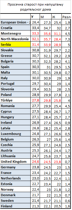 Насупрот њима, најниже просечне године, све испод 23, имале су Финска (21,3), Шведска (21,4), Данска (21,7) и Естонија (22,7 година).
