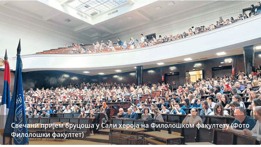 Предавања у новој академској години јуче су стартовала на већини факултета у Србији. Свечани пријем за бруцоше на појединим установама Универзитета у Београду организован је у недељу како је, на пример, било на Факултету организационих наука, док је већина њих амфитеaтре за нове студенте отворила јуче. Свечарска атмосфера владала је и на Филолошком факултету, где је управа јуче у подне дочекала бруцоше са две химне – државном „Боже правде” и оном универзалном, међународном студентском „Гаудеамус игитур”. Упркос слабијем одзиву на смеровима на којима школују наставнике српског језика и непопуњених чак 236 „буџетских” индекса, деканка Филолошког факултета проф. др Ива Драшкић Вићановић за наш лист истиче да тиме ни она ни њене колеге нису обесхрабрене. Јуче је на свечаном пријему дочекала око хиљаду бруцоша, овај пут уписаних по новој акредитацији, на четири студијска програма организована у 28 модула.