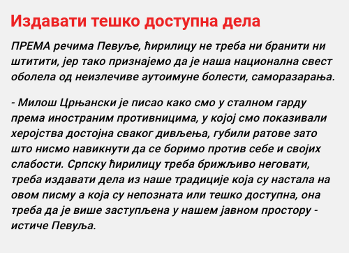 Певуља је кљуцнуо истину и када је рекао да српски језик и ћирилицу „не треба бранити, него их треба неговати“, да се ћирилица данас испразно „брани“. И то је истина, коју погоди Певуља, али не хтеде никако да каже како то треба стварно, у пракси, (СА)ЧУВАТИ ЋИРИЛИЦУ, а не празним причама, ЈЕР ЈЕ ОН, СУШТИНСКИ, СЕРБОКРОАТИСТА чим мисли да се ћирилица данас може вратити у живот задржавајући у норми српског језика два (алтернативна) писма. Певуља, мисли (тако себе продаје јефтино) да није сербокроатиста, а верује да се ћирилица може вратити у живот тако што ће се наставити комунистичка, југословенска фаворизација латинице. Он рече да ће се ћирилица чувати тако што ће се више објављивати старе књиге и списи на ранијем српском језику, што је трагично погрешно-смешно за спас ћирилице. Неће ћирилици помоћи ништа и никада више ако ми и даље задржимо двоазбучје у коме је, као што је, на неки начин злурадо, рекао ранији, претходни председник Одбора за стандардизцију српског језика: „Латиница је победила.“ Наравно да је „победила“ (и) у Србији, али није хтео да каже како је и зашто победила. А победила је, наравно, не зато што је боље и функционалније писмо, него тако што је комунистичка власт на све начине исфаворизовала међу Србима (хрватску) латиницу, па и преко ширења заблуда, као што је ова Певуљина заблуда да ће ћирилица поново почети да живи само тако што ћемо објављивати више књига из ранијих периода, а задржати двоаубучку шизофренију само код Срба.