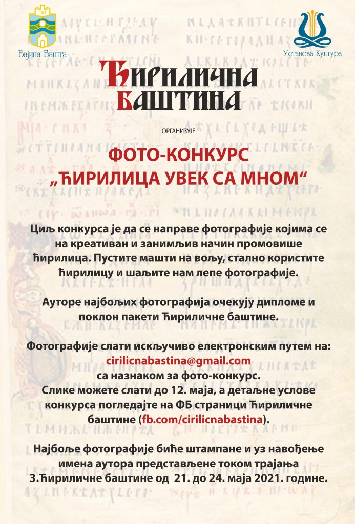 Бајина Башта – У циљу промоције ћирилице и српског језика и писма манифестација Ћирилична баштина организује фото – конкурс „Ћирилица увек са мном“.